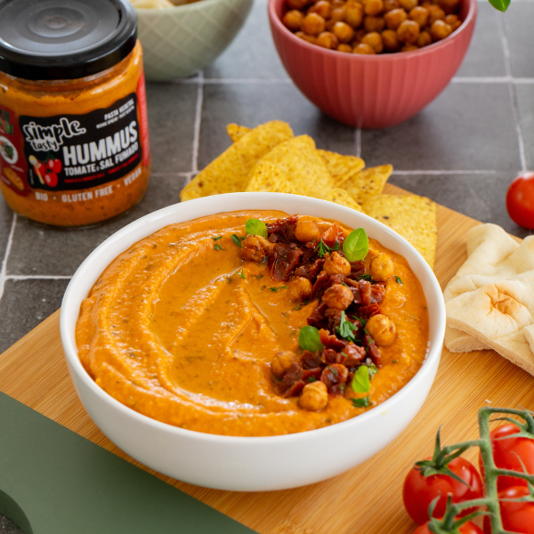 Grão-de-bico cozido com pasta de tomate, tahini e sal fumado. O Hummus Tomate e Sal Fumado Simple® Tasty é uma deliciosa combinação de sabores que dá um toque especial a qualquer refeição. Com ingredientes naturais de origem biológica, é ideal para acompanhar com vegetais, para dar mais sabor às saladas, barrar no pão ou comer com tostas.