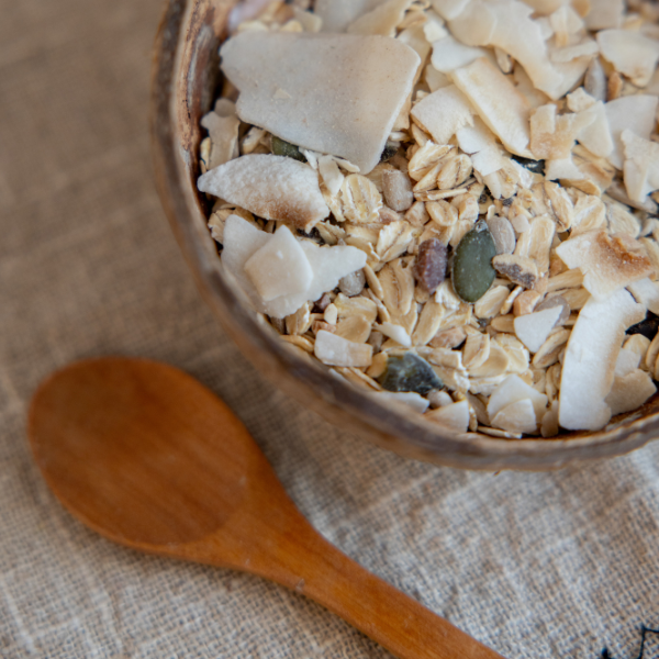 Flocos de Aveia Integral (Sem Glúten) com Coco, Amendoim, Noz-Pecã E Nibs De Cacau O Muesli Relax Simple® Bite é um muesli vegan, sem adição de açúcares* e sem glúten, pensado para ser desfrutado em momentos de calma e tranquilidade. Composto por uma mistura de flocos de aveia integral sem glúten, sementes de chia e girassol, nibs de cacau, chips de coco e deliciosos pedaços de noz-pecã. Contém Niacina (Vitamina B3) que contribui para o normal funcionamento do sistema nervoso e da função psicológica, e para a redução do cansaço e fadiga. Contém também Fósforo que contribui para o normal metabolismo produtor de energia. Muesli Relax Simple® Bite fornece, por 100 g, a quantidade significativa da dose diária recomendada para se produzirem os efeitos benéficos alegados para a Niacina e Fósforo.